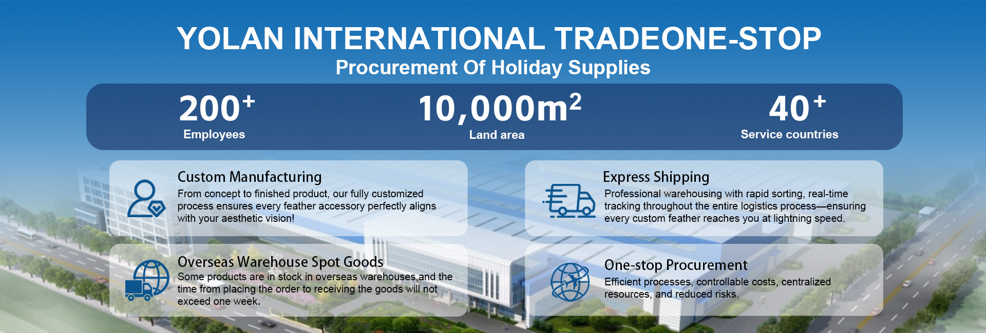 Yolan Industry and Trade Co., Ltd. was established in 2017. Our company specializes in international trade sales, festival supplies, and feather crafts production.